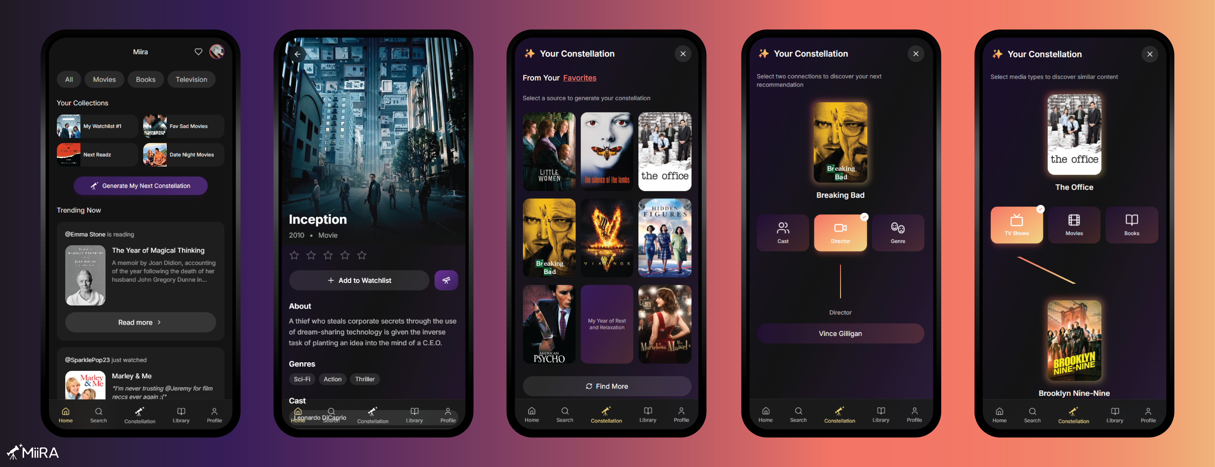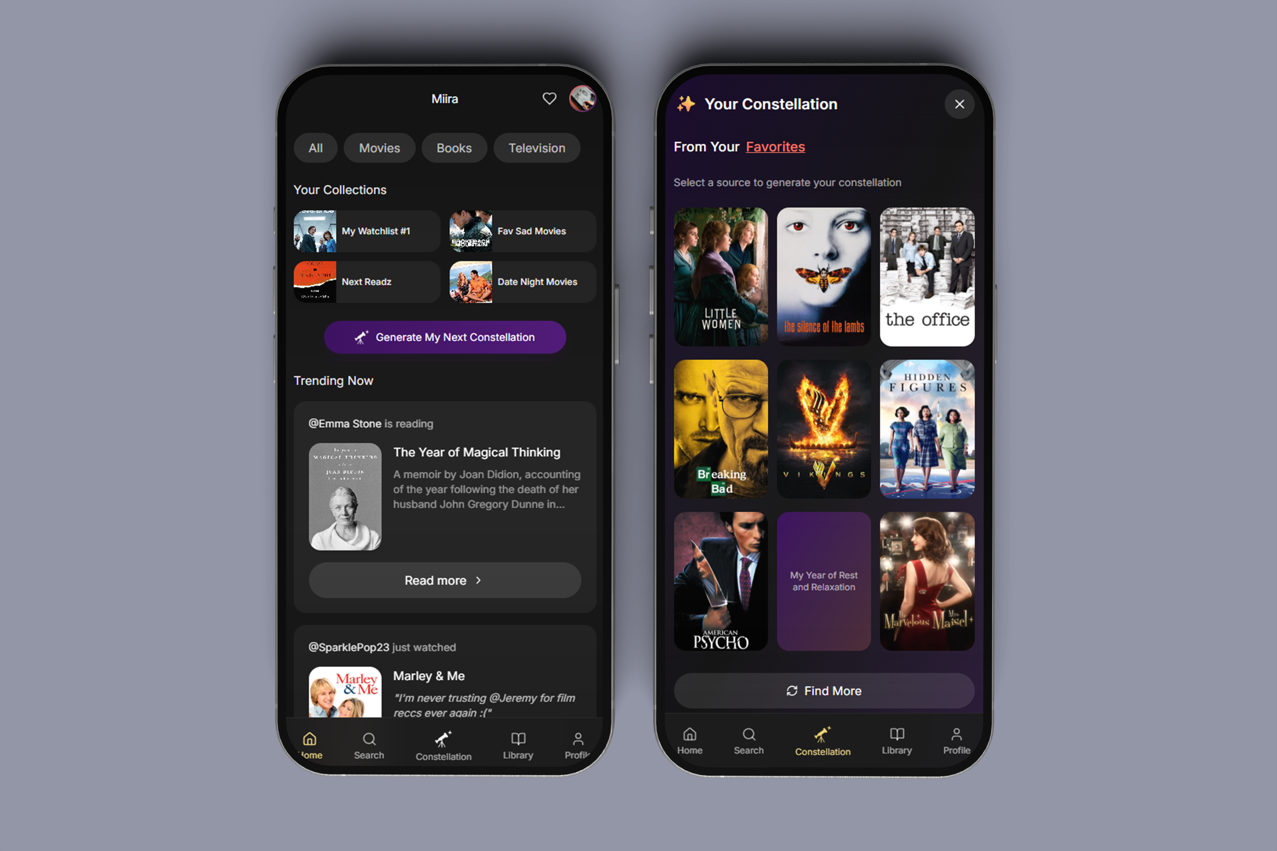 Worked in Figma to design UI for media rating and suggestion application. Developed branding: ‘mira’ (Spanish: look). Project goal: MiiRA utilizes content-specialized algorithm to suggest cross-platform media (film -> TV -> books) making connections between cast, genre, director, etc.The UI centers a ‘constellation’ visualization of media recommendation, as the app generates unique connections (like stars in the sky). Creative assets: App Icon (telescope with star) UI design: Dark, night-sky like appearance with an emphasis on glowing orange and yellow stars in deep purple background.
