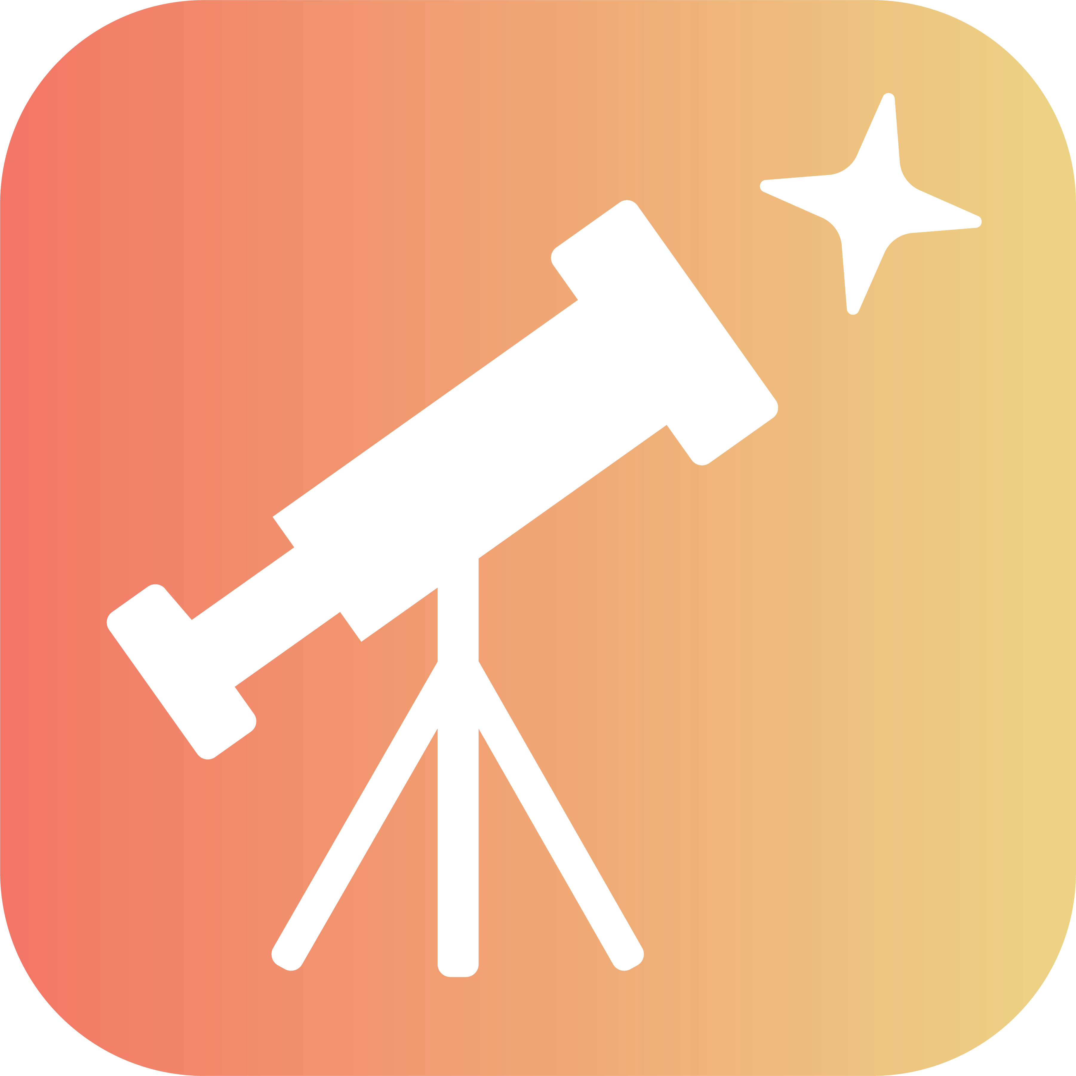 The UI centers a ‘constellation’ visualization of media recommendation, as the app generates unique connections (like stars in the sky). Creative assets: App Icon (telescope with star) UI design: Dark, night-sky like appearance with an emphasis on glowing orange and yellow stars in deep purple background.